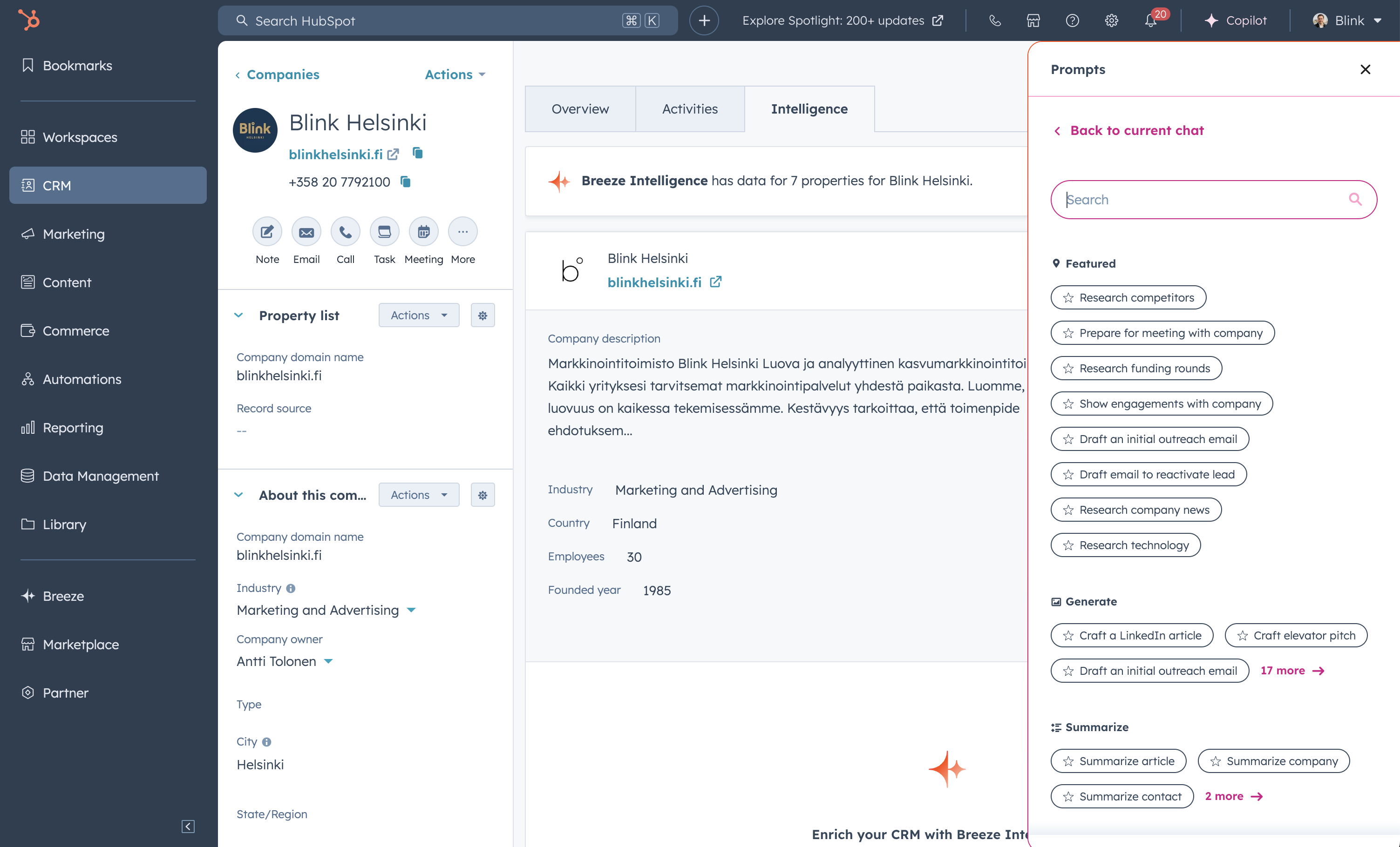 Breeze Copilot on HubSpotin virtuaaliassistentti, aina paikalla HubSpot-portaalin navigaatiossa (myös mobiiliapplikaatiossa) ja lisäksi relevanteissa kohdin tarjoamassa apuaan.